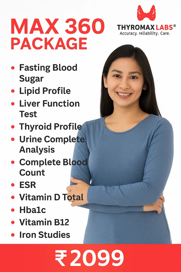 The Max 360 Package is Thyromax Labs®’ most advanced preventive health checkup, offering a complete diagnostic overview including blood sugar, cholesterol, thyroid, liver, kidney, CBC, ESR, HbA1c, Vitamin D, Vitamin B12, Iron Studies, and urine analysis.