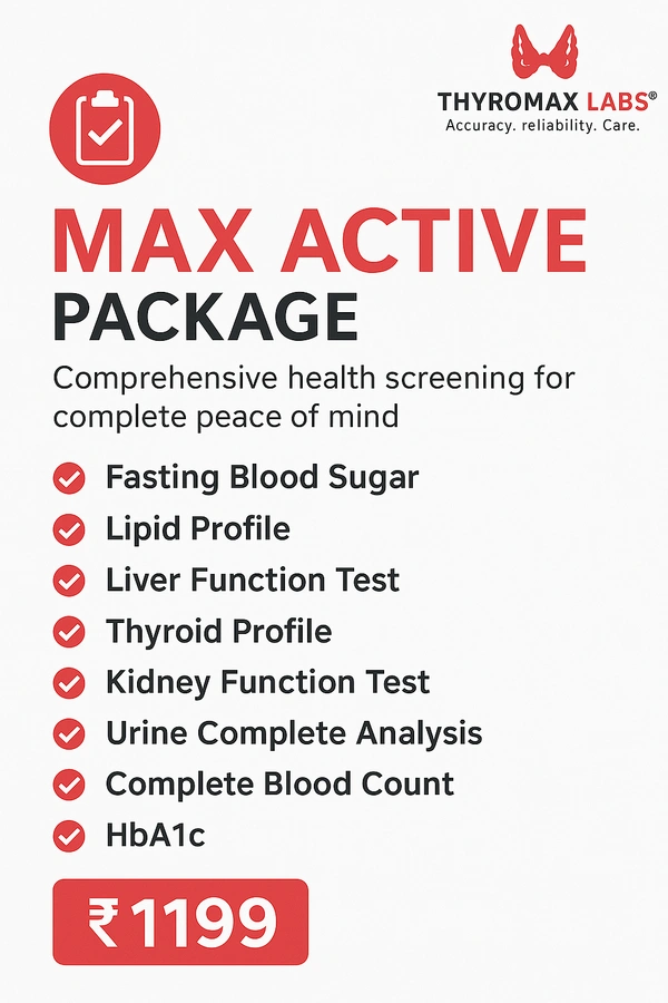 Looking for a thorough preventive health checkup that gives you deeper insight into your well-being? The Max Active Package from Thyromax Labs® is a comprehensive diagnostic panel covering 8 essential test profiles that assess your body’s major systems.